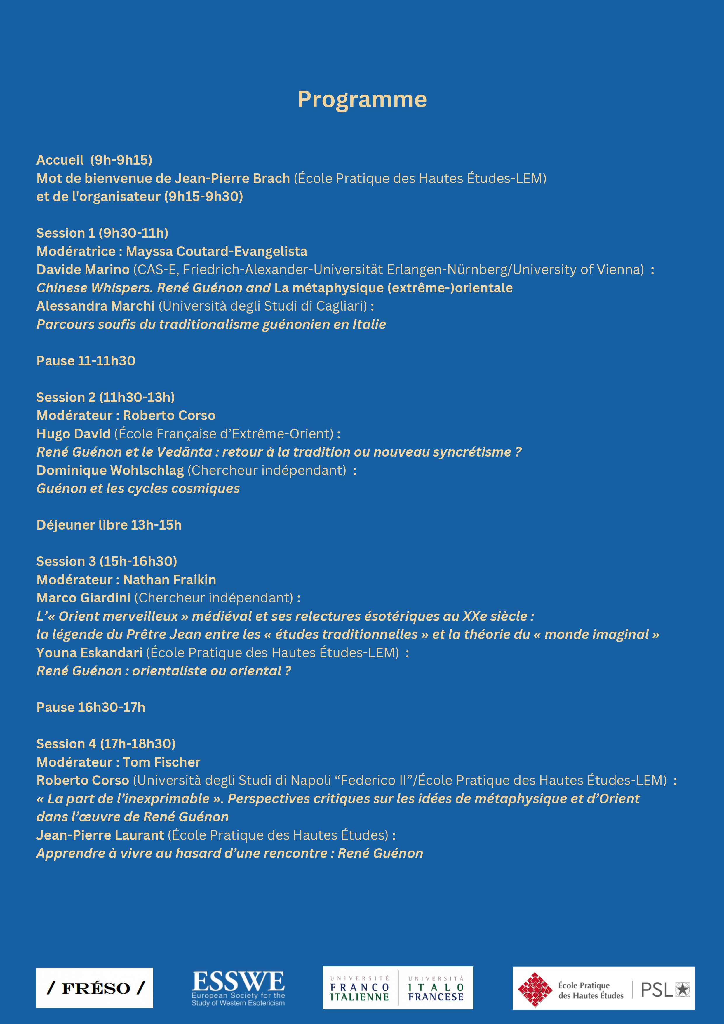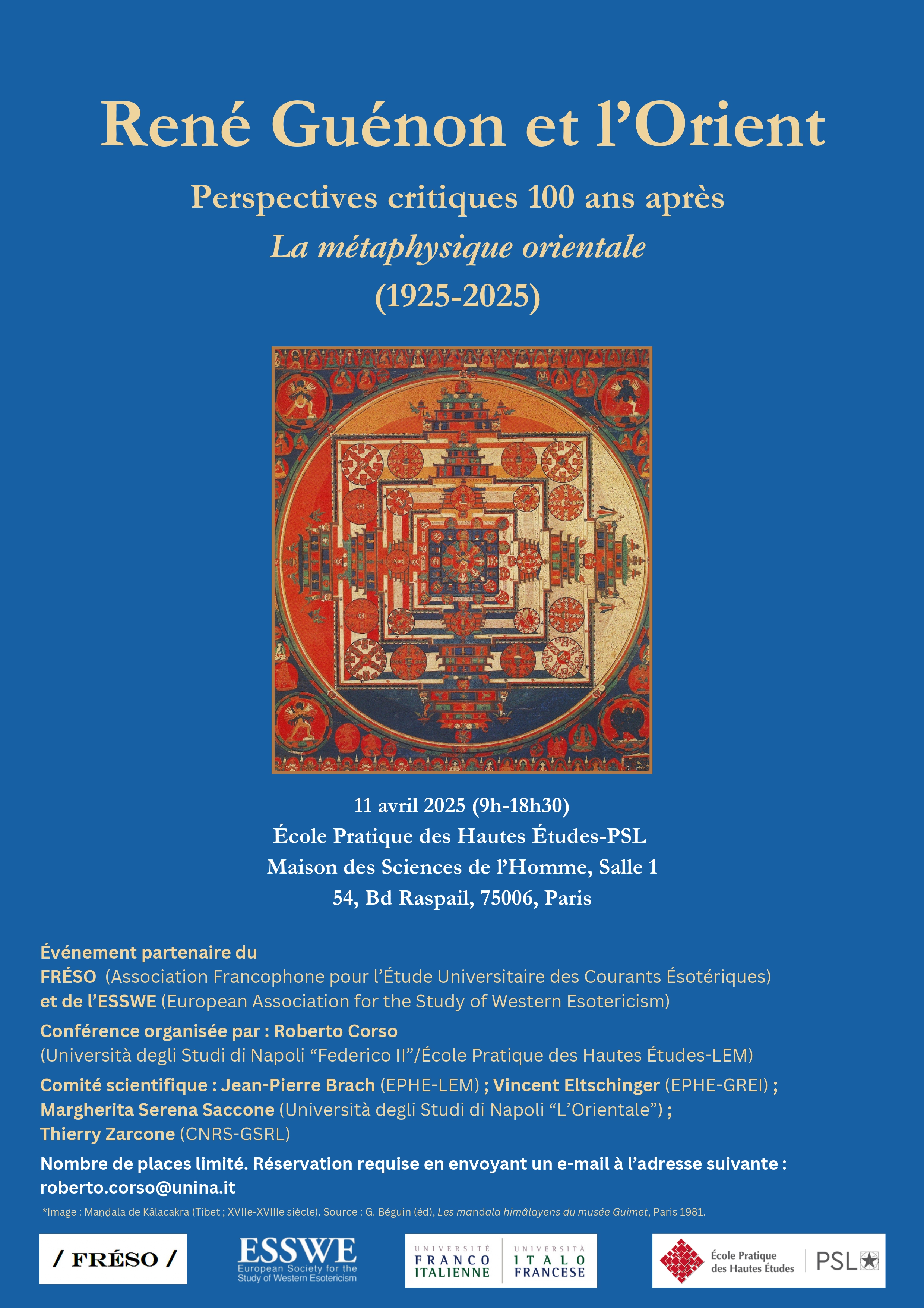 Cette conférence dédiée à René Guénon a été organisée par l'Università degli Studi di Napoli “Federico II” et l'École Pratique des Hautes Études en partenariat avec FRÉSO (Association Francophone pour l’Étude Universitaire des Courants Ésotériques), l’ESSWE (European Association for the Study of Western Esotericism) et l'Université Franco Italienne.