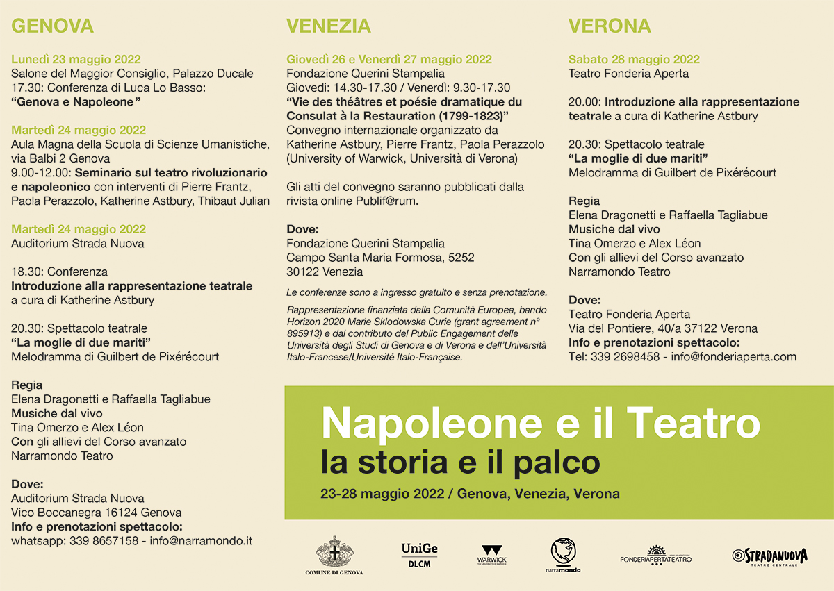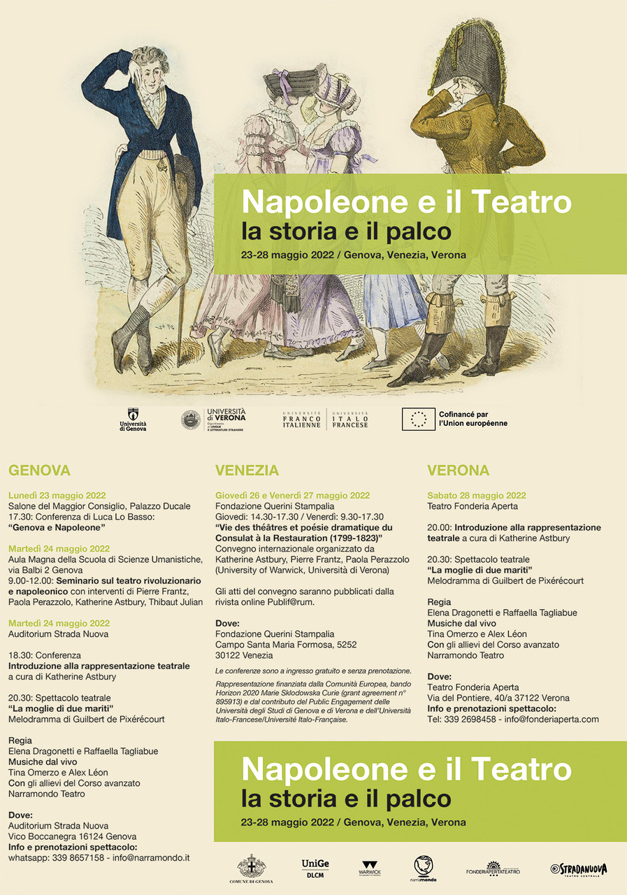 Nell’ambito degli eventi organizzati in occasione del bicentenario della morte di Napoleone I, avrà luogo il seminario organizzato dall’università di Genova e, in particolare, dalle prof.sse Elisa Bricco, Anna Giaufret e Paola Perazzolo. Saranno illustrati lo sviluppo della tragedia, della commedia, del melodramma e dell’arte drammatica con un’attenzione particolare alle partiche culturali dell’epoca compresa tra i secoli XVIII e XIX.