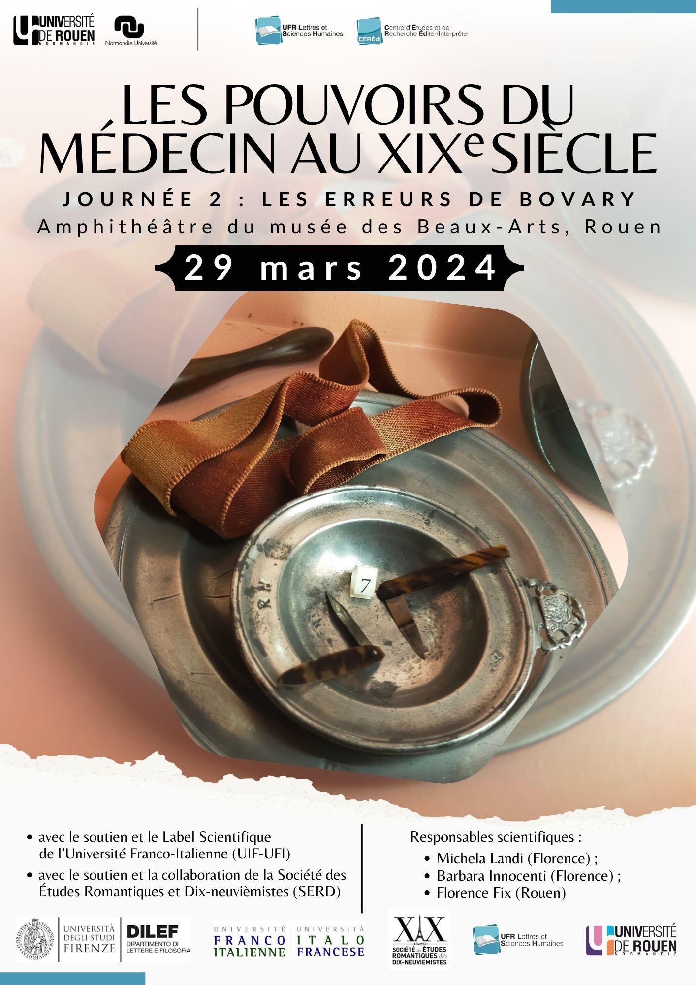 Questa seconda giornata di studi organizzata dal dipartimento di lettere e scienze umane dell'Università di Rouen in partenariato con il Centre d'Études et de Recherche Éditer/Interpréter, il dipartimento di Lettere e Filosofia dell'Università di Firenze e la Société des Études Romantiques et Dix-Neuviémistes è dedicata ai poteri dei medici nel XIX° secolo. La mattina sarà dedicata alla mélecture del corpo femminile e il pomeriggio ai ciarlatani e manipolatori. In fine giornata è prevista la visita del museo Flaubert e di storia della medicina.